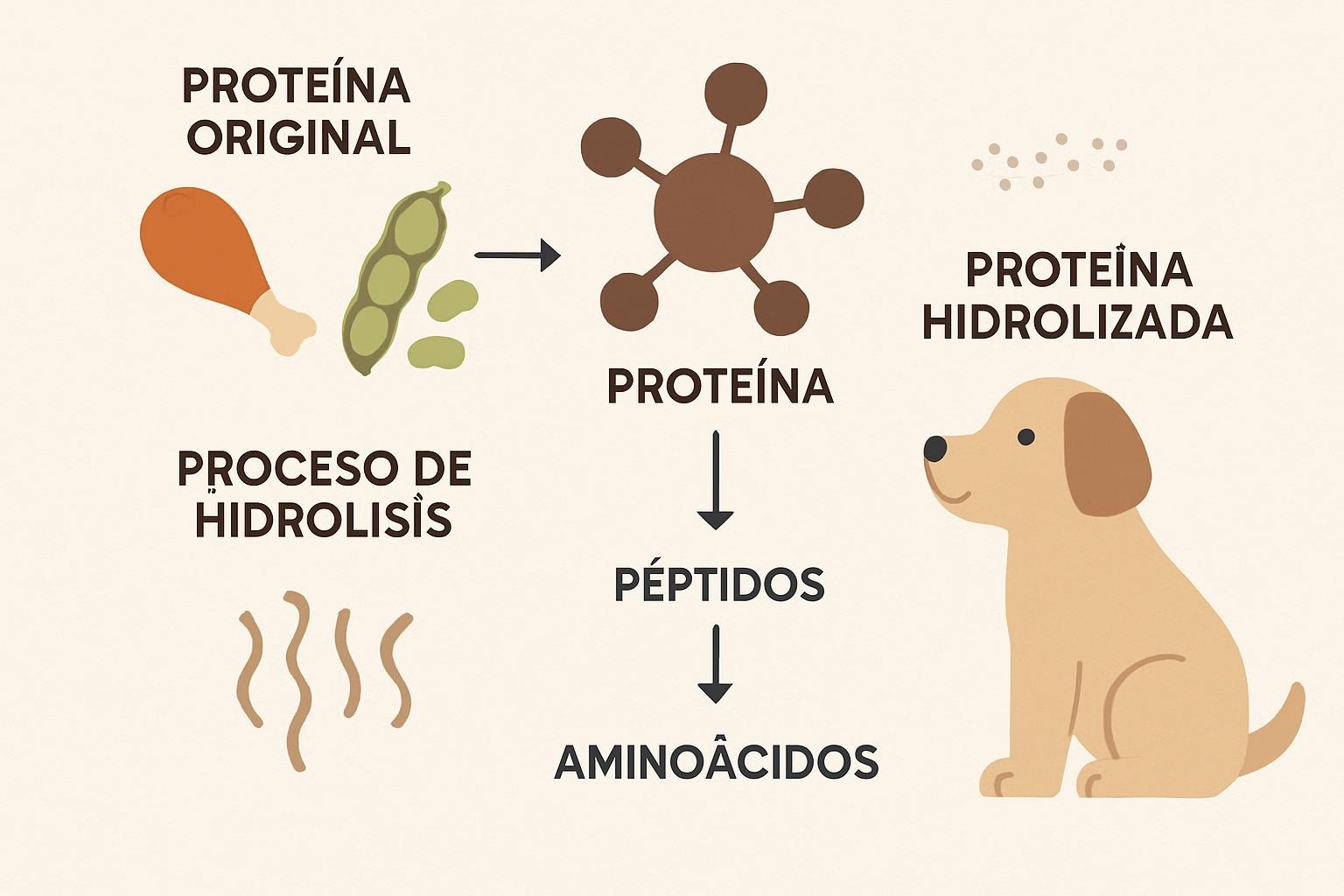 Considerada la vanguardia en el tratamiento de alergias alimentarias graves, la proteína hidrolizada es el resultado de un proceso donde las proteínas originales (como el pollo o la soya) se descomponen químicamente en fragmentos tan pequeños (péptidos y aminoácidos) que el sistema inmunológico del perro no los detecta como alérgenos. En esencia, la proteína sigue ahí, pero está «escondida» a nivel molecular. Esta estrategia es especialmente útil cuando el dueño no puede identificar el alérgeno exacto o cuando el perro es sensible a múltiples fuentes proteicas.